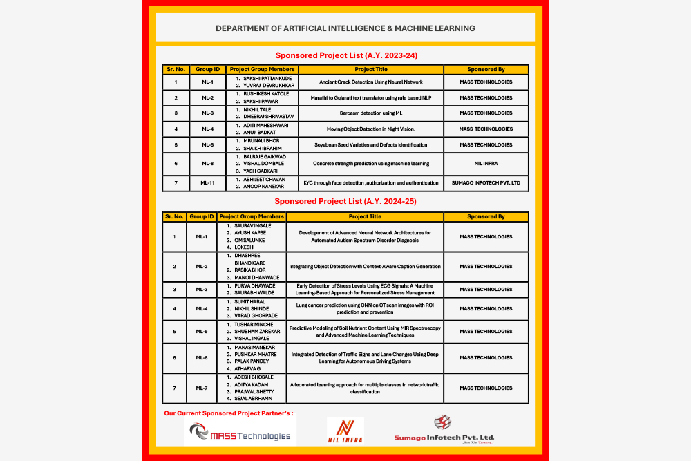 The department of Artificial Intelligence & Machine Learning (AI & ML) is established in the academic year 2020-2021. This is a 4-year degree course approved by AICTE, New Delhi under Savitribai Phule Pune University (SPPU). The Department has experienced faculty members/staff and the state of art research laboratories. The curriculum of AI & ML is prescribed by SPPU.